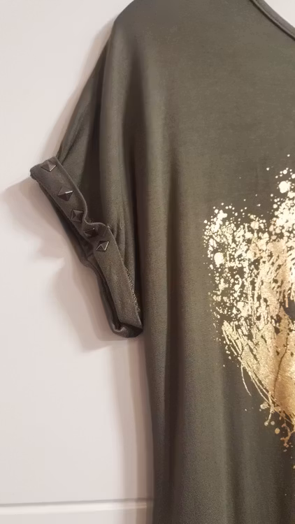 I mossgrönt och guld går denna rymliga tröja med snygg skärning i midjan som får ett snyggt fall när det sitter på.