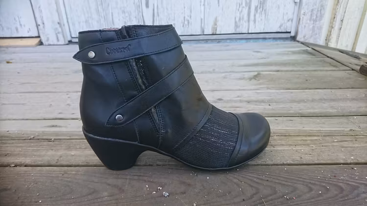Stövlett i skinn med präglat parti framtill, dragkedja på insidan av stövletten. Kil med mönster ton i ton samt två remmar med kardborre på utsidan.